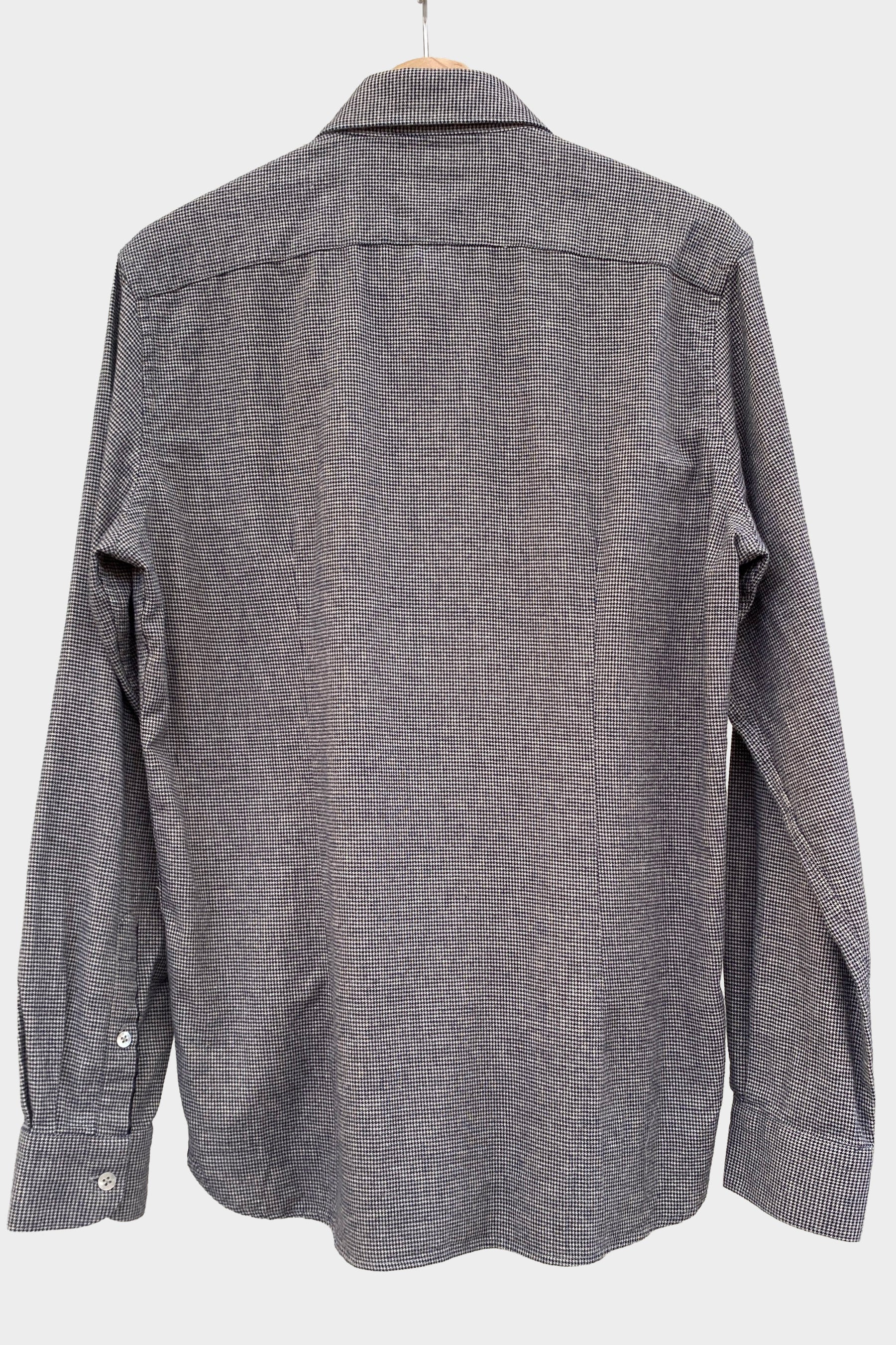 Camisa de franela estampado con dibujo de pata de gallo mini de colores azul oscuro y gris. Formato slim fit. Detalles propios de la marca como los botones de nácar salvo el último botón de la tapeta del cierre central que imita uno metálico al estilo vintage. Cuello italiano abierto y en la espalda pinzas laterales para que quede ajustada al cuerpo. Como siempre, se caracteriza esta marca por añadir un pequeño cordón a tono en el interior del cuello y en los puños de la camisa. Se puede llevar por dentro o por fuera con detalles en las esquinas de color azul marino. Es 100% de algodón rascado para que de sensación más abrigada.