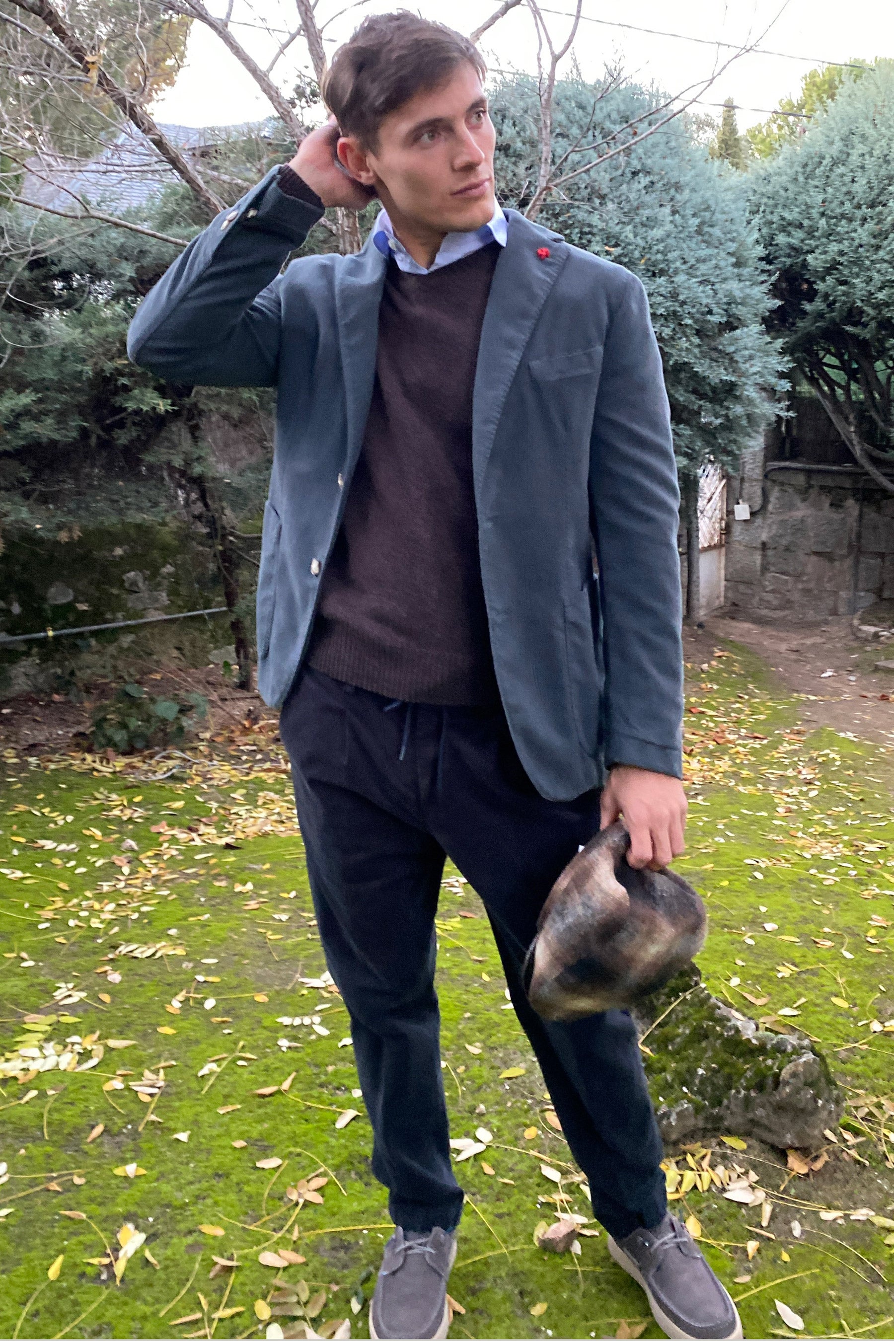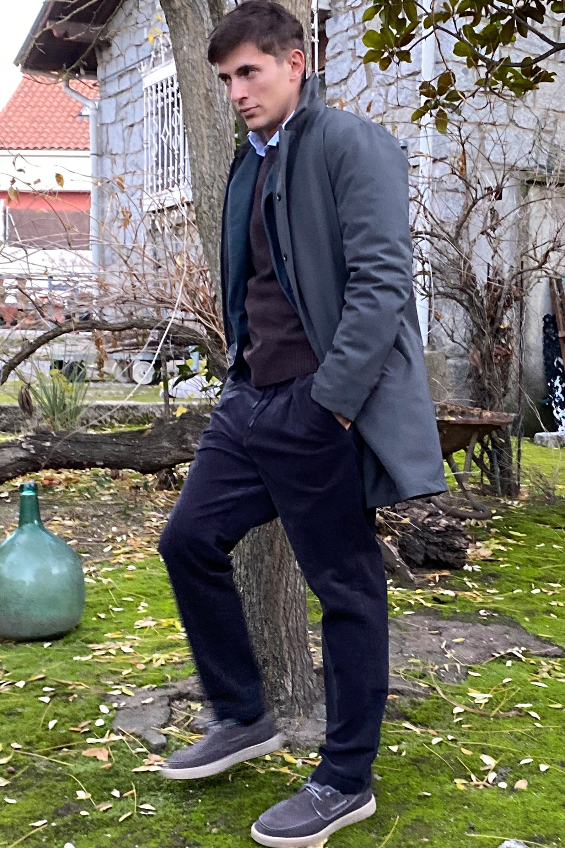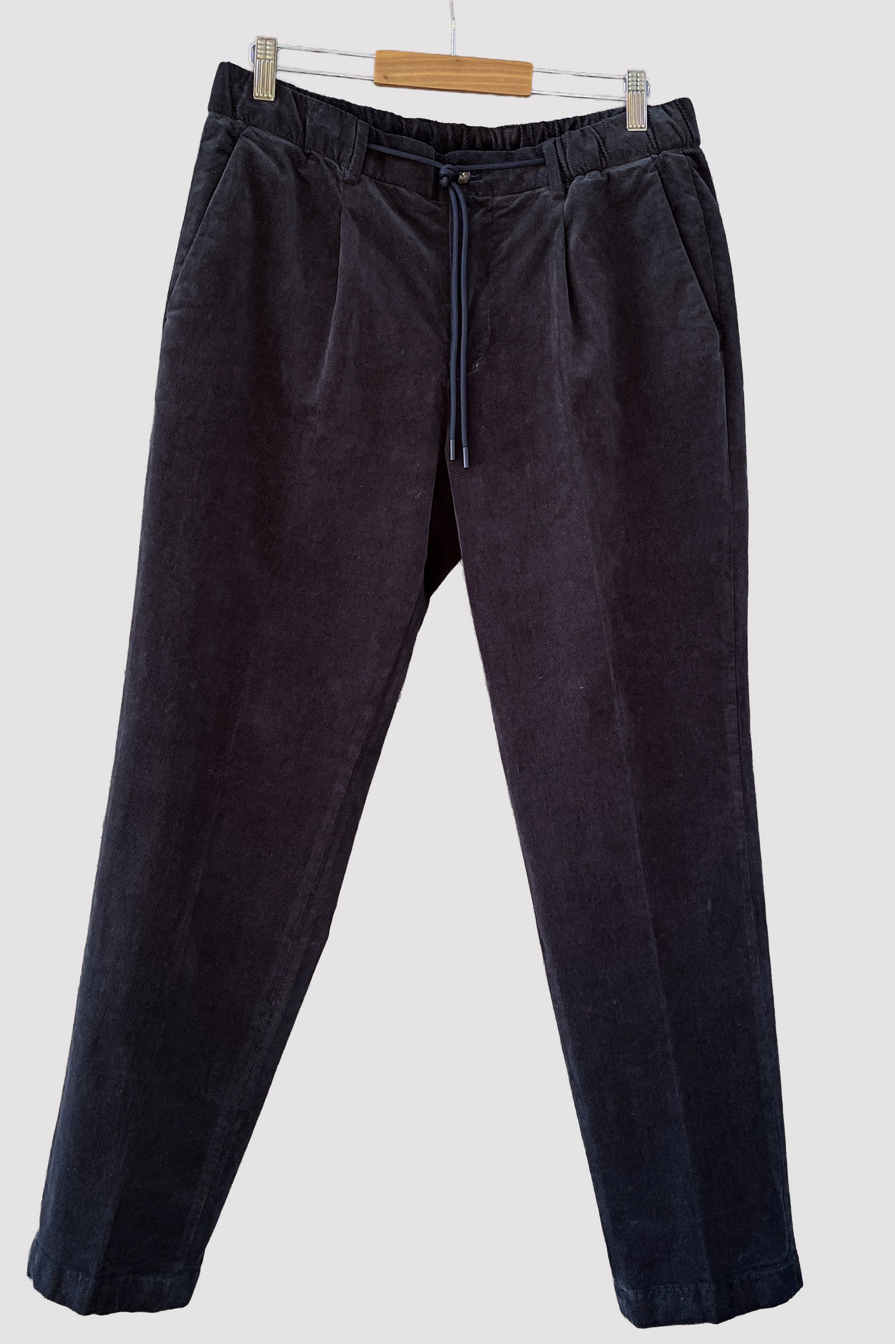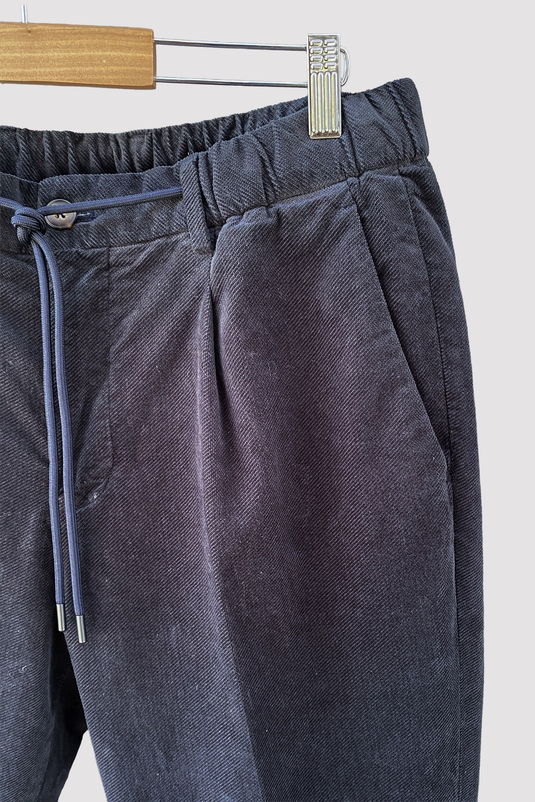 Pantalón ancho de corte moderno con pinza azul marino. Confeccionado con fustán, un textil aterciopelado de algodón 98% y elastano 2%. La cintura es elástica y lleva un cordón ajustable que se puede anudar y dejar a la vista o bien se puede llevar oculto. Bolsillos laterales y traseros con cierre de botón.