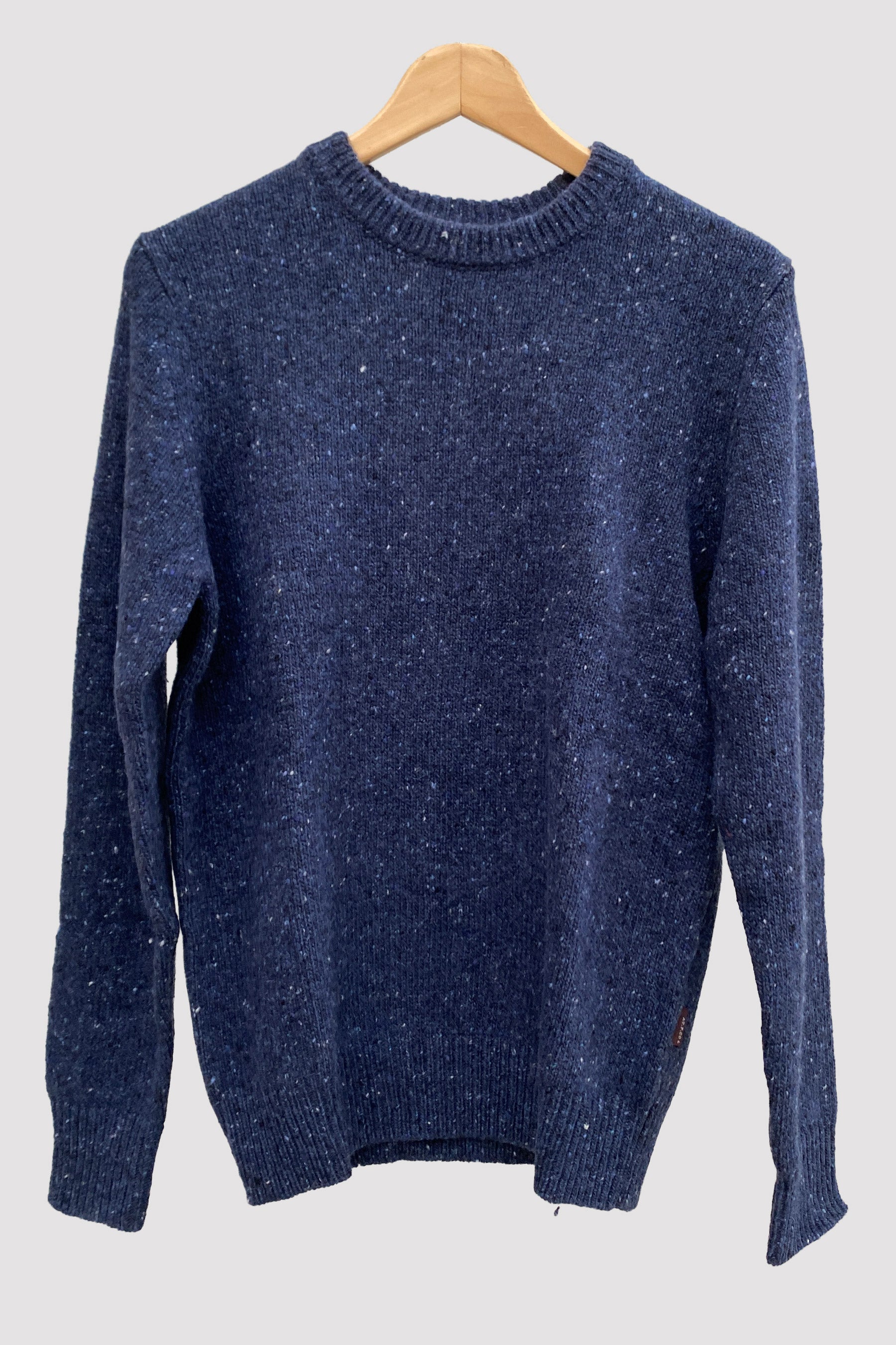 Jersey de cuello redondo confeccionado con mezcla de lana (5% alpaca, 65% lana, 30% poliamida). Es de punto liso y lleva cuello, puños y cintura acanalados. Color azul. La marca la lleva en una etiqueta muy discreta en el lateral izquierdo de la prenda.