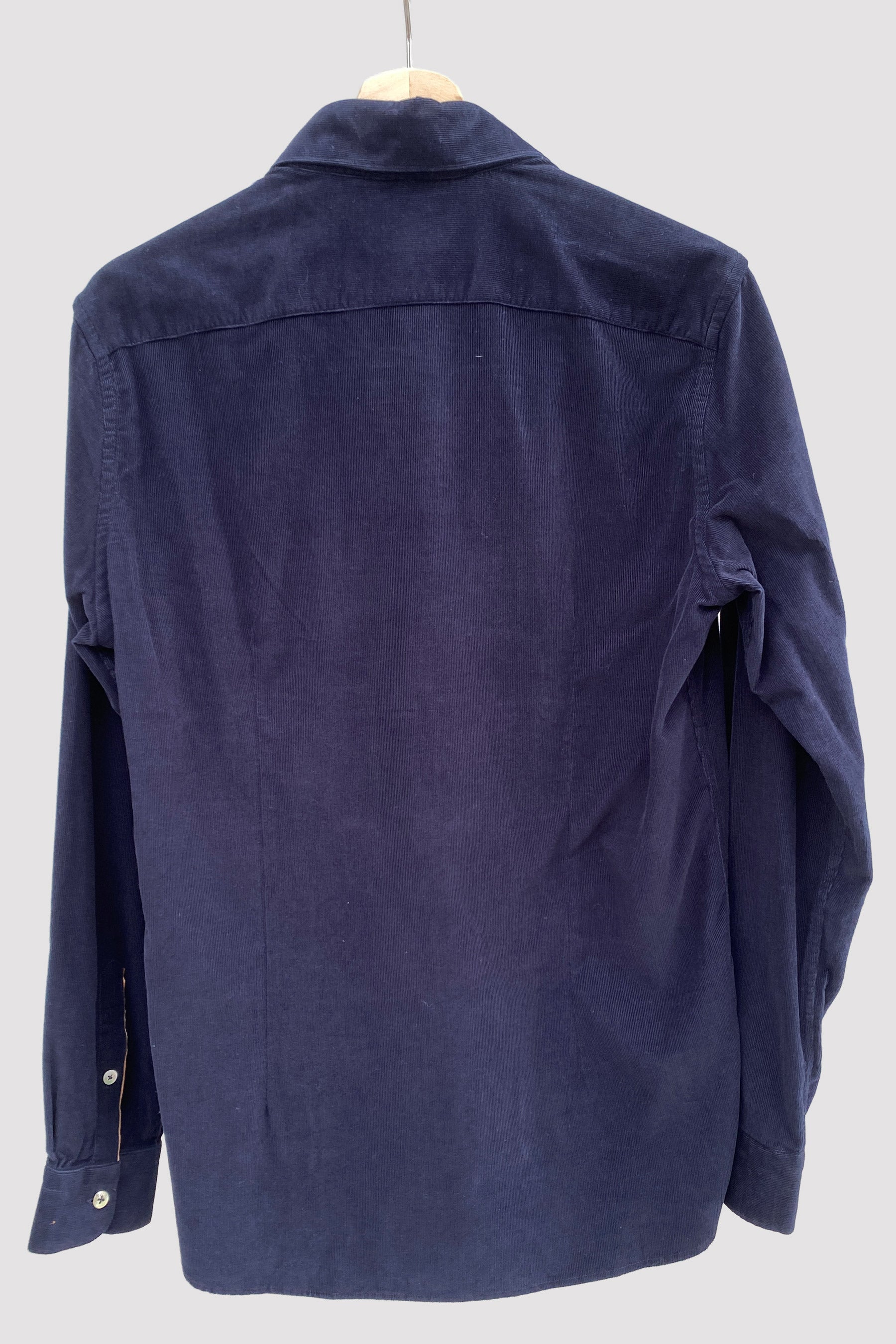 Camisa de micropana color navy oscuro. Tiene cuello italiano abierto con ballenas, botones de nácar salvo el último botón de la tapeta del cierre central que imita uno metálico al estilo vaquero. Formato slim fit, con costuras laterales en la espalda para que quede ajustada al cuerpo. Puños clásicos con cierre de botón y, como sello de la firma, un fino cordón de color camel en el interior del cuello y en los puños de la camisa. Se puede llevar por dentro o por fuera con detalles en las esquinas de color azul marino. 100% algodón.