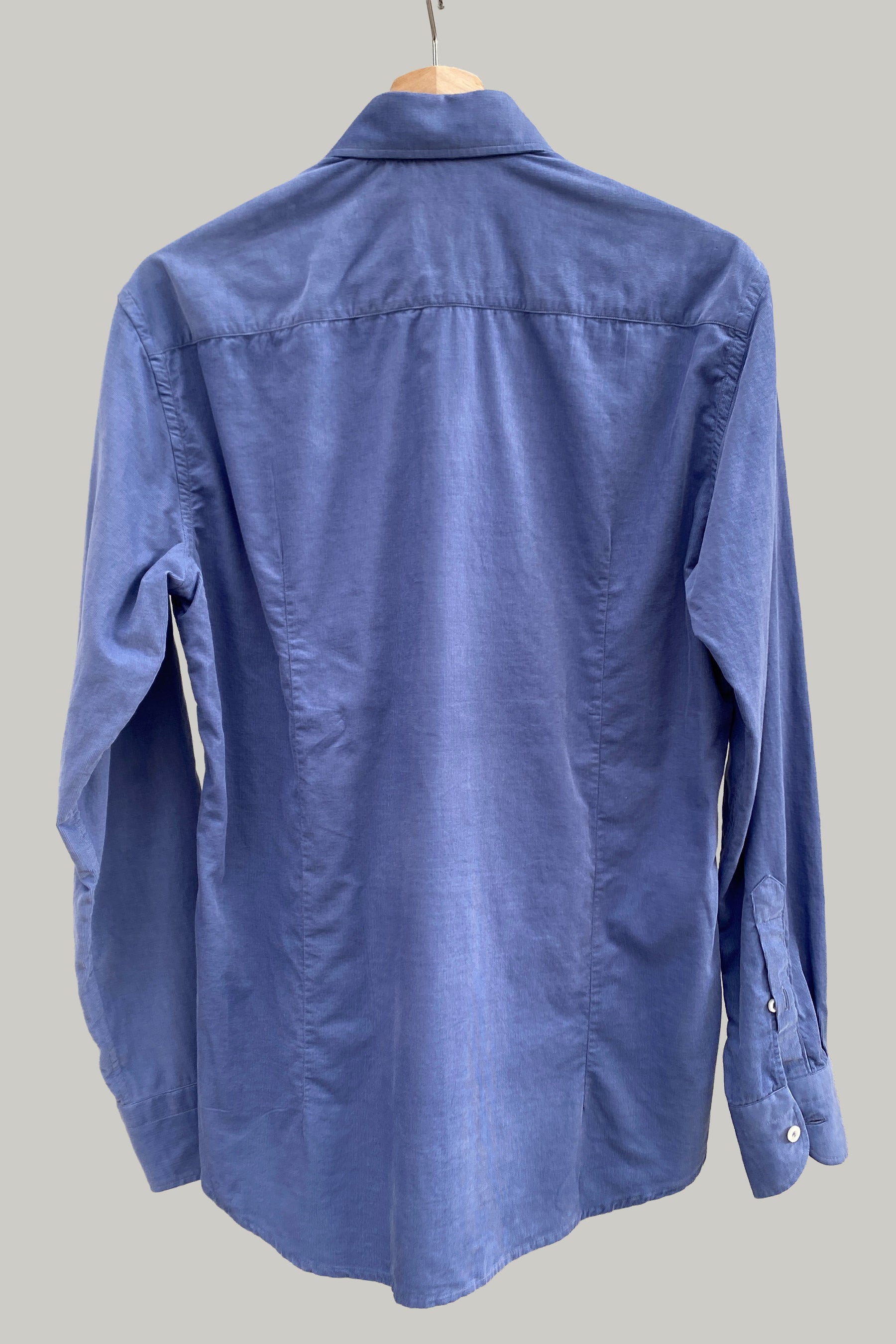 Camisa de micropana color azul claro lavanda. Tiene cuello italiano abierto, botones a tono y pinzas cosidas en la espalda. Puños clásicos con cierre de botón. Formato relajado, es decir, no es slim fit, y se puede llevar por fuera o por dentro. Diseñado y fabricado en Italia.