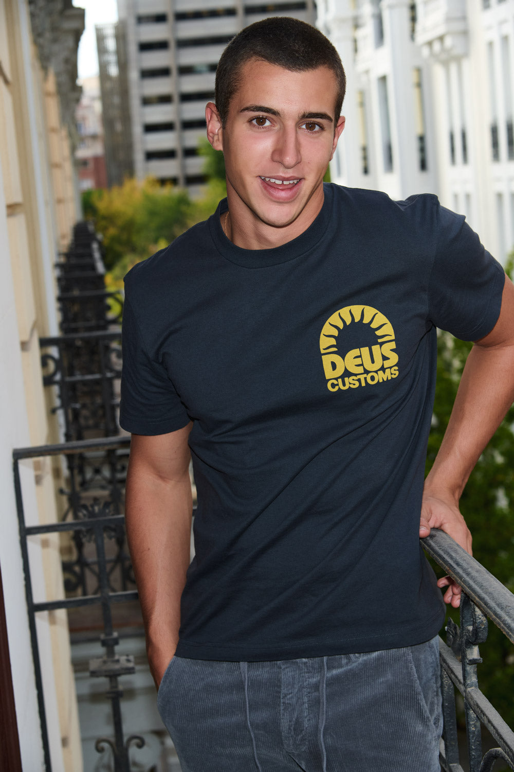 Este diseño de Deus pertenece a la colección de invierno de 2025. Es color antracita y tiene un dibujo en el frente y en la espalda con el logo de Deus Customs en contraste con un sol amarillo. Alude al sol que se ve en el horizonte cuando vamos conduciendo por la carretera o cuando estamos surfeando. Camiseta de manga corta con corte cuadrado y ancho, de silueta relajada y más suelta que las camisetas "regular fit" tradicionales de la marca. Está fabricado de jersey de algodón reciclado, lavado a la piedra con enzimas fuertes, para conseguir ese efecto lavado tan único.