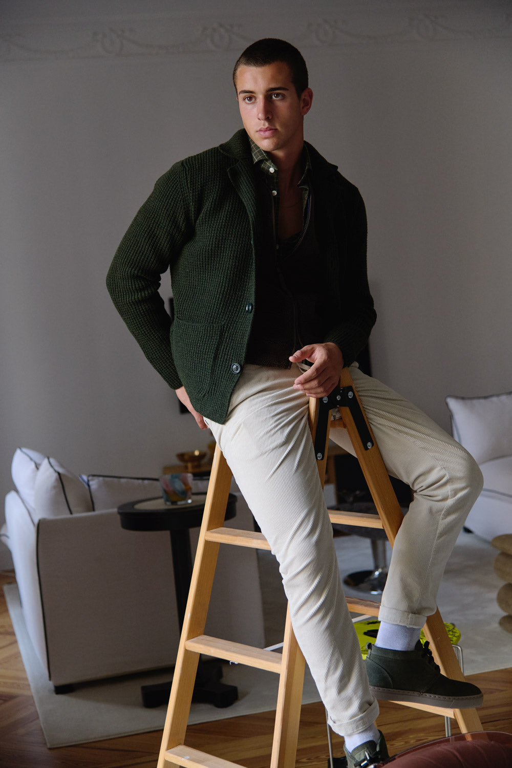 Pantalón chino de pana gorda color blanco roto. En la cintura lleva goma en los laterales, trabillas y cordón. Formato regular slim y tiro medio. Tiene cinco bolsillos, los de detrás están asegurados con botón