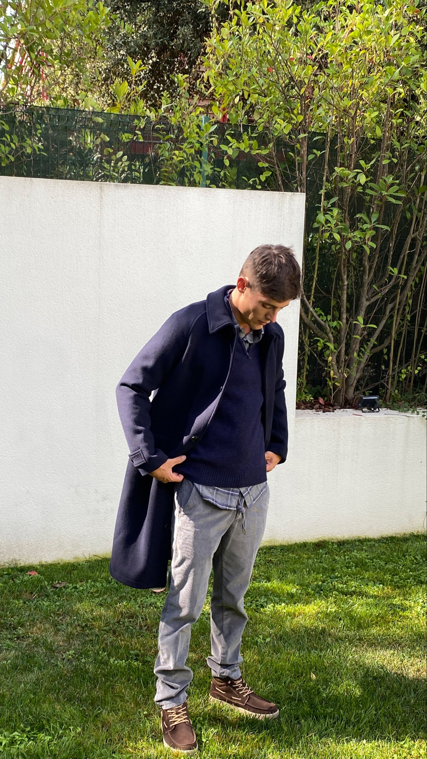 Pantalón chino de pana gorda color gris roto. En la cintura lleva goma en los laterales, trabillas y cordón. Formato regular slim y tiro medio. Tiene cinco bolsillos, los de detrás están asegurados con botón
