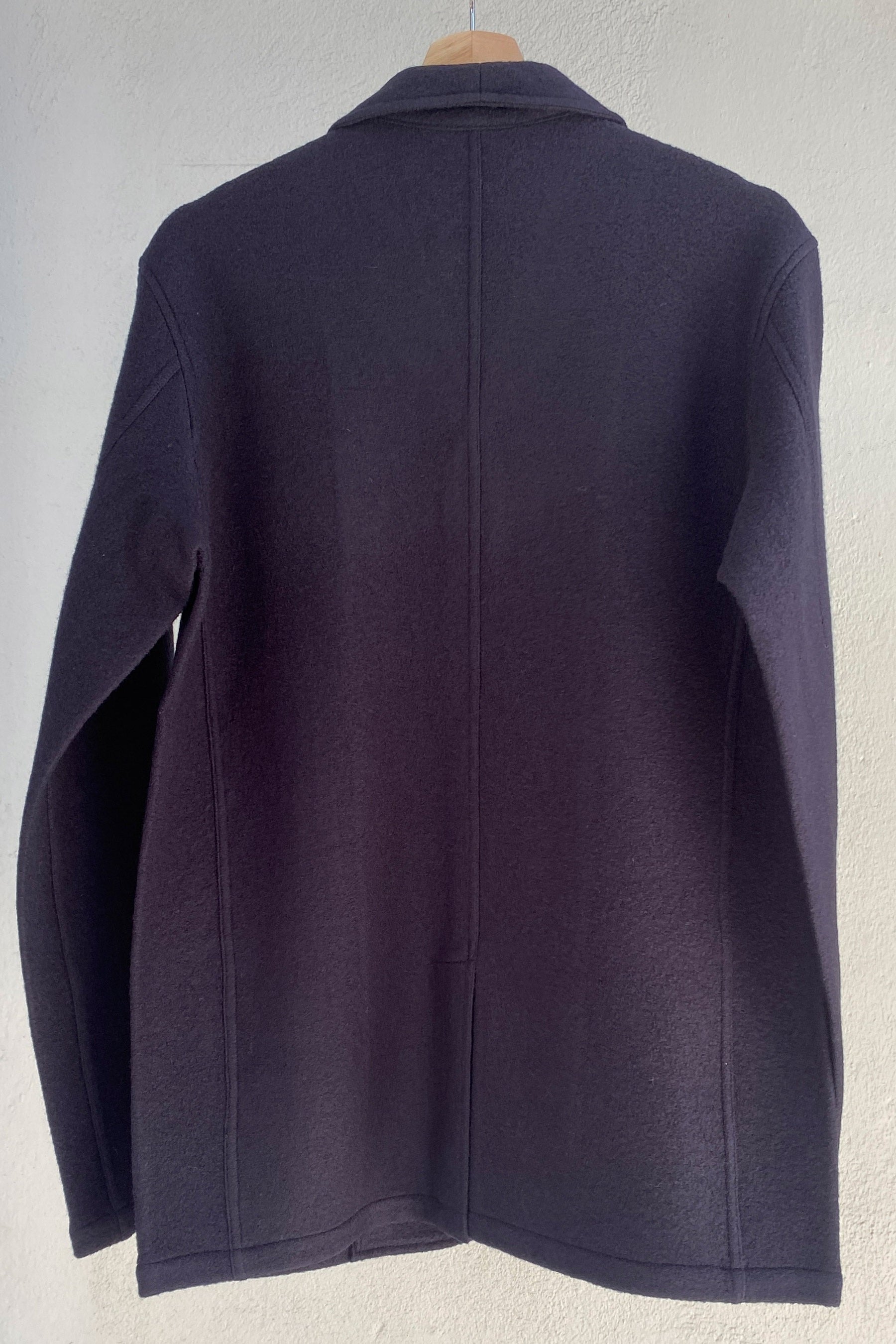 Chaqueta blazer de hombre desestructurada confeccionada en lana cocida. Cierre frontal de 4 botones, solapa normal con botón y ojal para poder cerrar el cuello. Lleva en el frontal 3 bolsillos parcheados y en la espalda una abertura central. Los puños de las mangas llevan un botón que se puede abrochar o llevar desabrochado y remangado. El corte de esta chaqueta es ligeramente entallado.