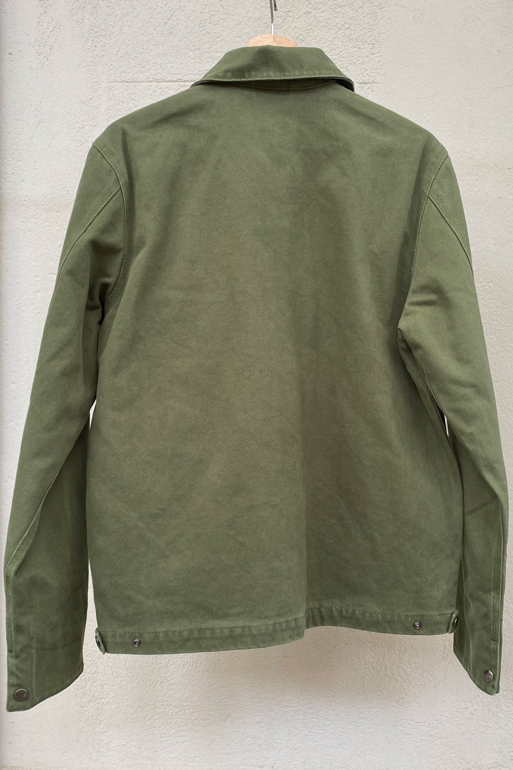 Cazadora verde confeccionada en denim, el cual uso tras uso, se adapta a la persona. Su corte es cuadrado estilo chaqueta workwear. Cierre de cremallera de doble dirección y doble botón metálico de presión en los puños y a ambos lados de la cintura para poder ajustarlo. Lleva la marca bordada en el pecho. Bolsillos inferiores en los laterales de ribete y bolsillo en el pecho con cremallera. También lleva un bolsillo interior invisible con cierre de velcro. Fabricado con sarga de algodón y con forro interior de algodón y poliéster con efecto lanoso. Tintado en prenda con pigmentos mediante un lavado a la piedra con enzimas de alto rendimiento