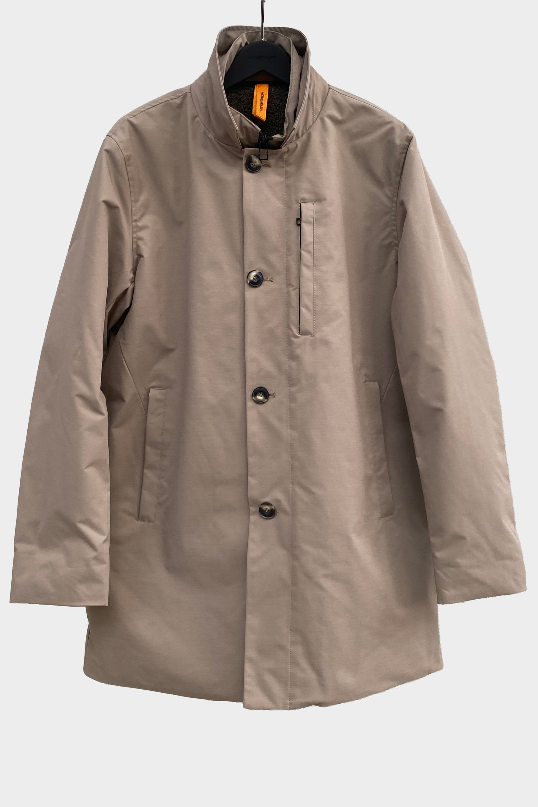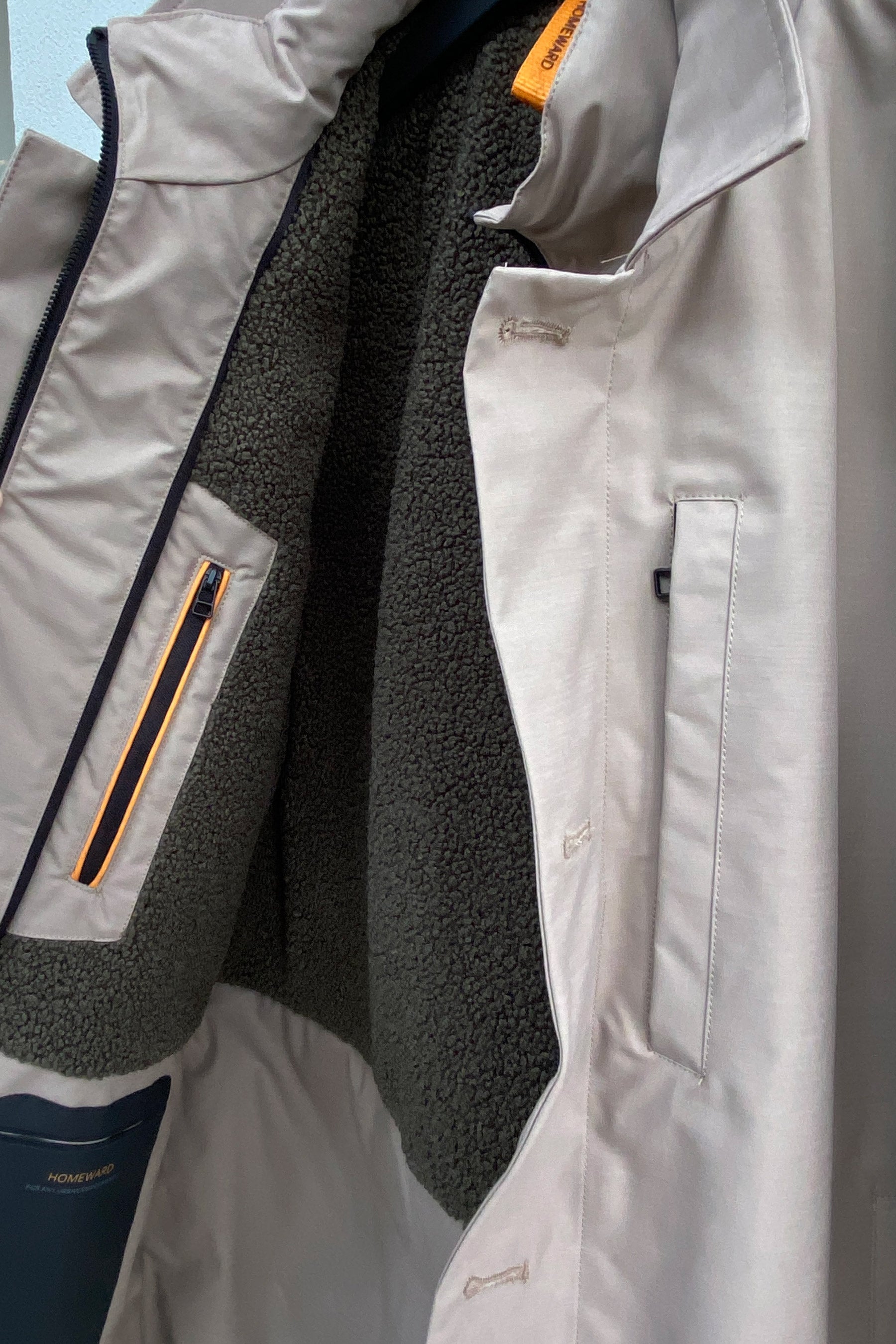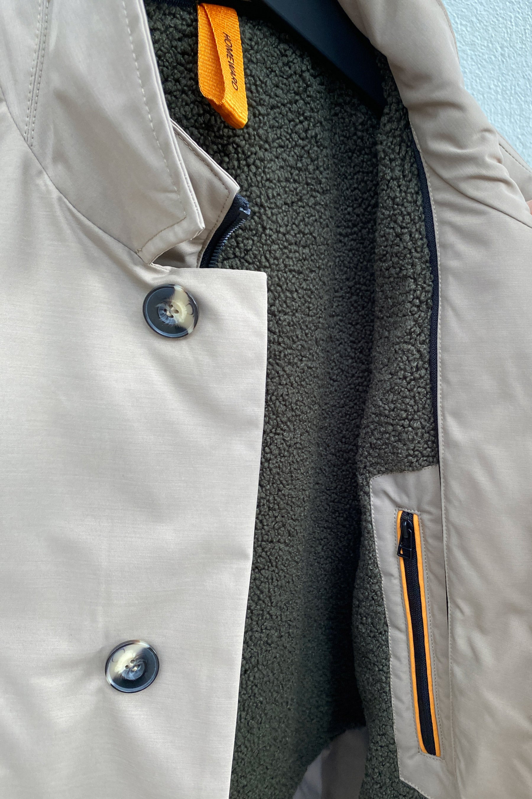 Gabardina abrigo con forro de sherpa y tacto de algodón. Es corta y de color beige. Confeccionada de sarga (tejido de estructura diagonal) con tacto suave de algodón es una prenda acolchada con interior de borreguito de forro polar color oscuro a tono. su característica fundamental es que es impermeable y también es cortavientos. El cierre central es de 4 botones y en el interior lleva una pechera desmontable para los días más fríos, con cierre de cremallera y cuello alto. Cuenta con tres bolsillos en el exterior, con cierre de cremallera, y, en el interior también con el mismo cierre, tiene uno a cada lado con el mismo cierre, así como un apartado invisible adicional para llevar el móvil. En la espalda, una apertura con botón de iman.