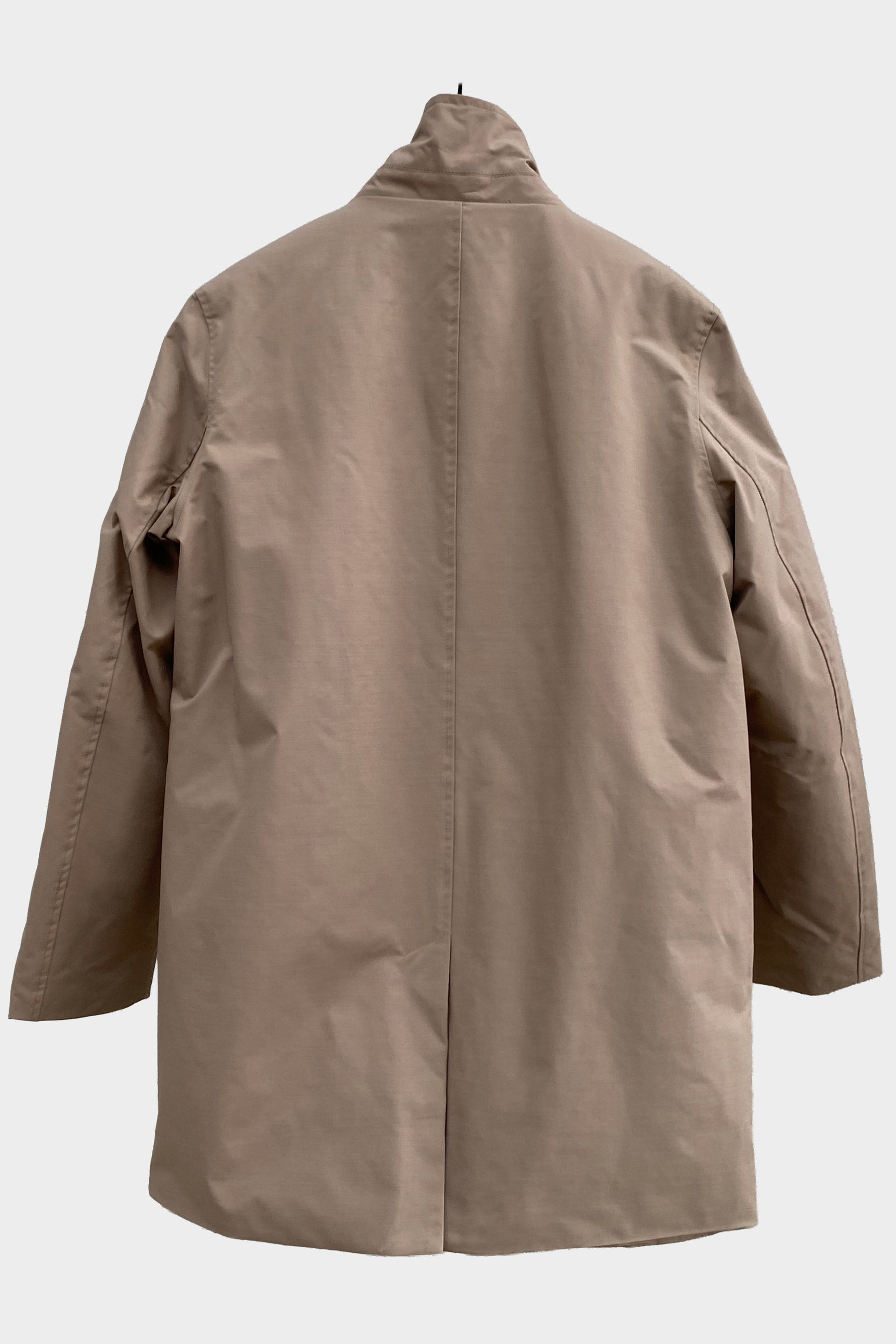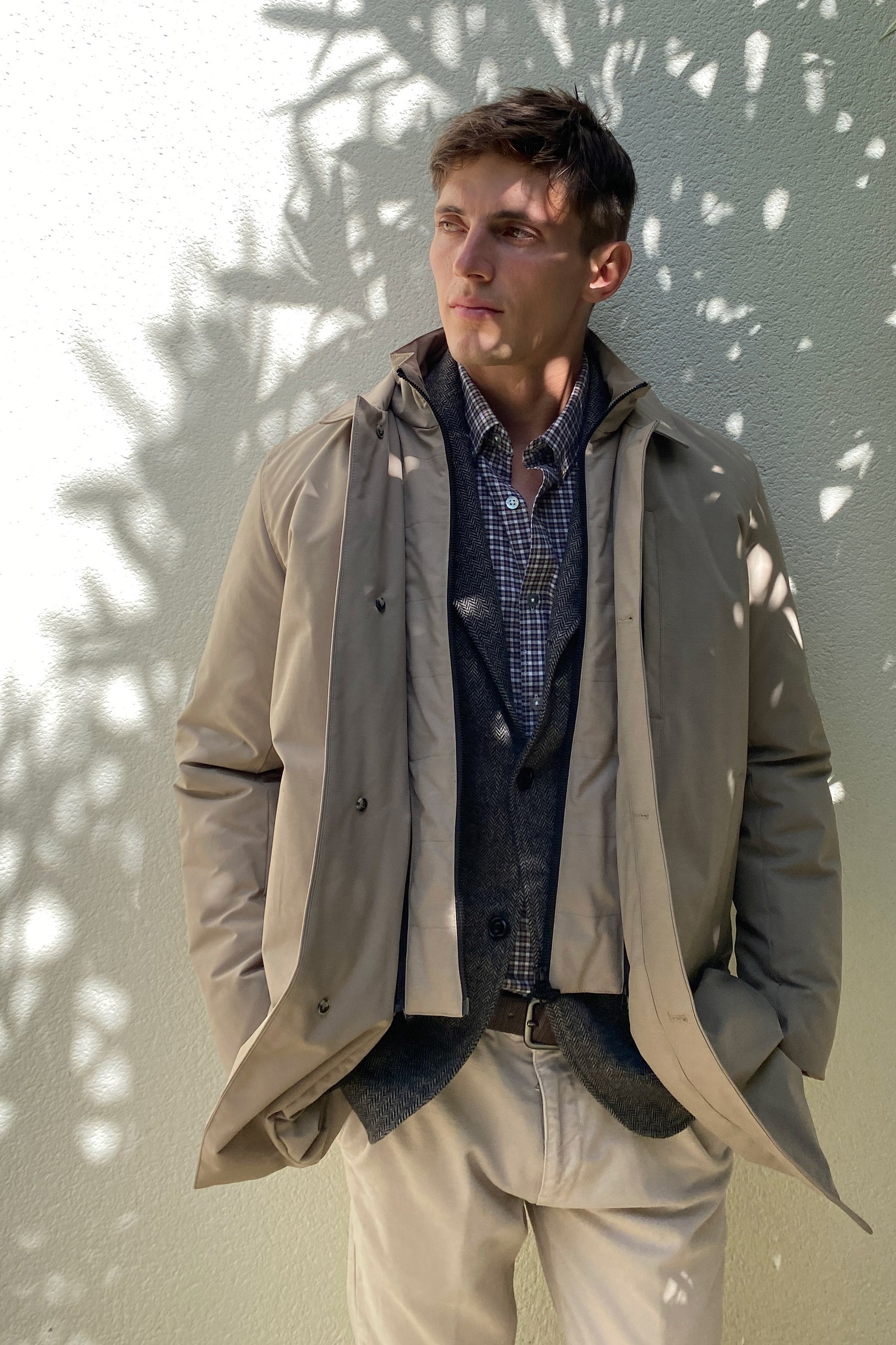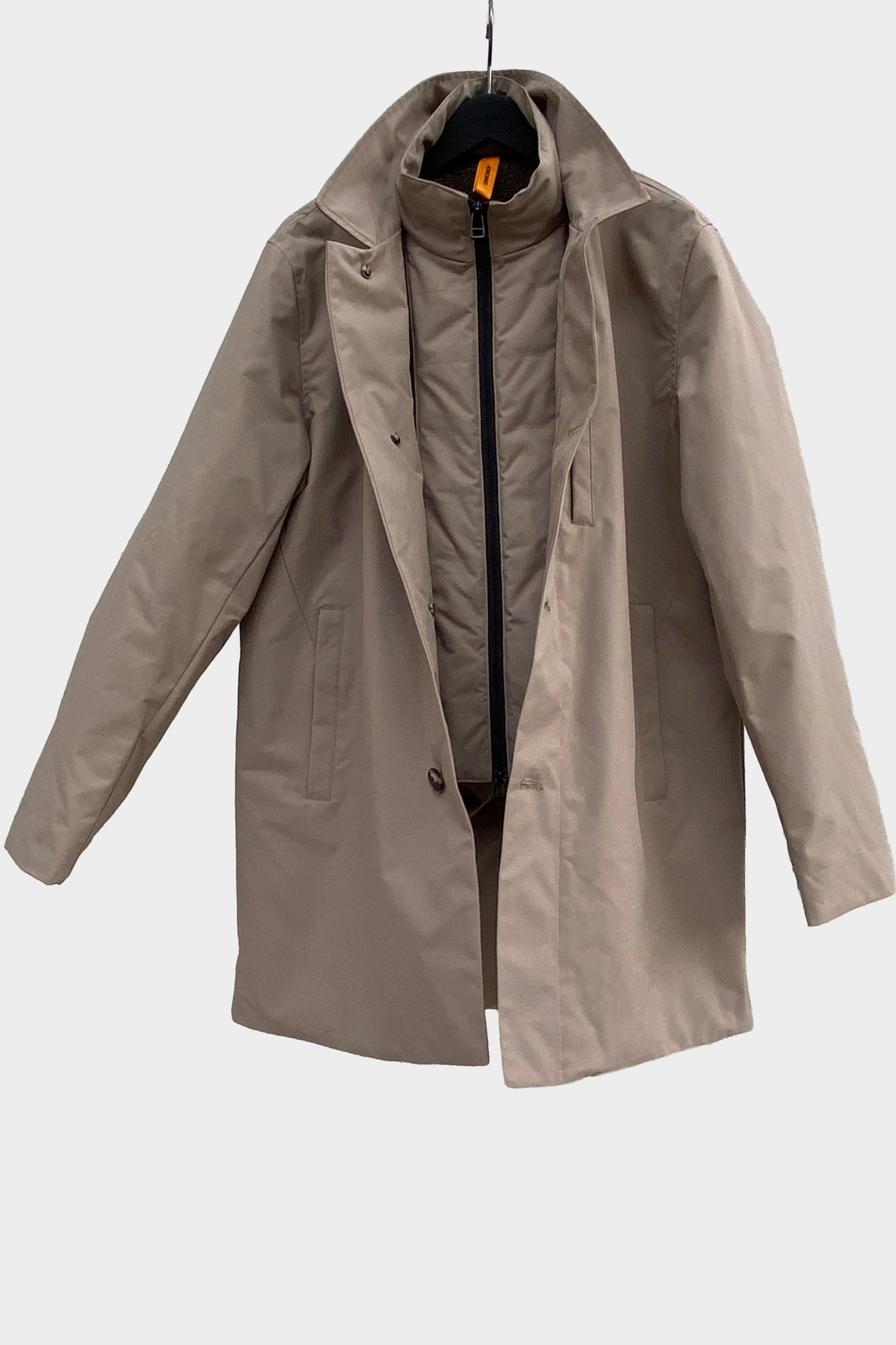 Gabardina abrigo con forro de sherpa y tacto de algodón. Es corta y de color beige. Confeccionada de sarga (tejido de estructura diagonal) con tacto suave de algodón es una prenda acolchada con interior de borreguito de forro polar color oscuro a tono. su característica fundamental es que es impermeable y también es cortavientos. El cierre central es de 4 botones y en el interior lleva una pechera desmontable para los días más fríos, con cierre de cremallera y cuello alto. Cuenta con tres bolsillos en el exterior, con cierre de cremallera, y, en el interior también con el mismo cierre, tiene uno a cada lado con el mismo cierre, así como un apartado invisible adicional para llevar el móvil. En la espalda, una apertura con botón de iman.