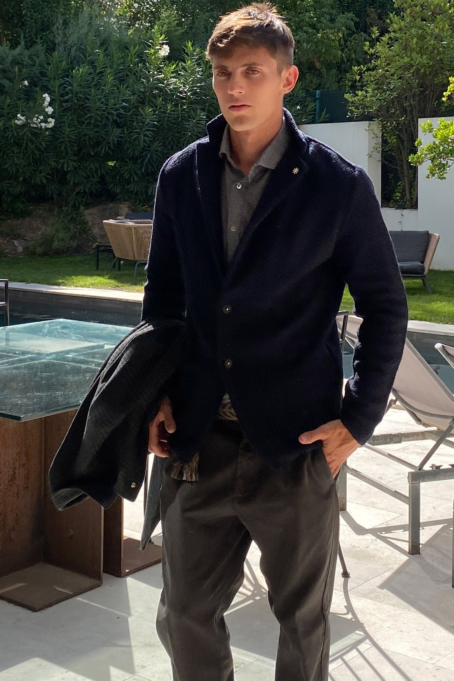 Chaqueta tipo cárdigan de punto azul marino oscuro. Lleva dos botones y dos bolsillos de parche delanteros. Efecto espiga en mezcla de lana virgen con alpaca y fibra acrílica.