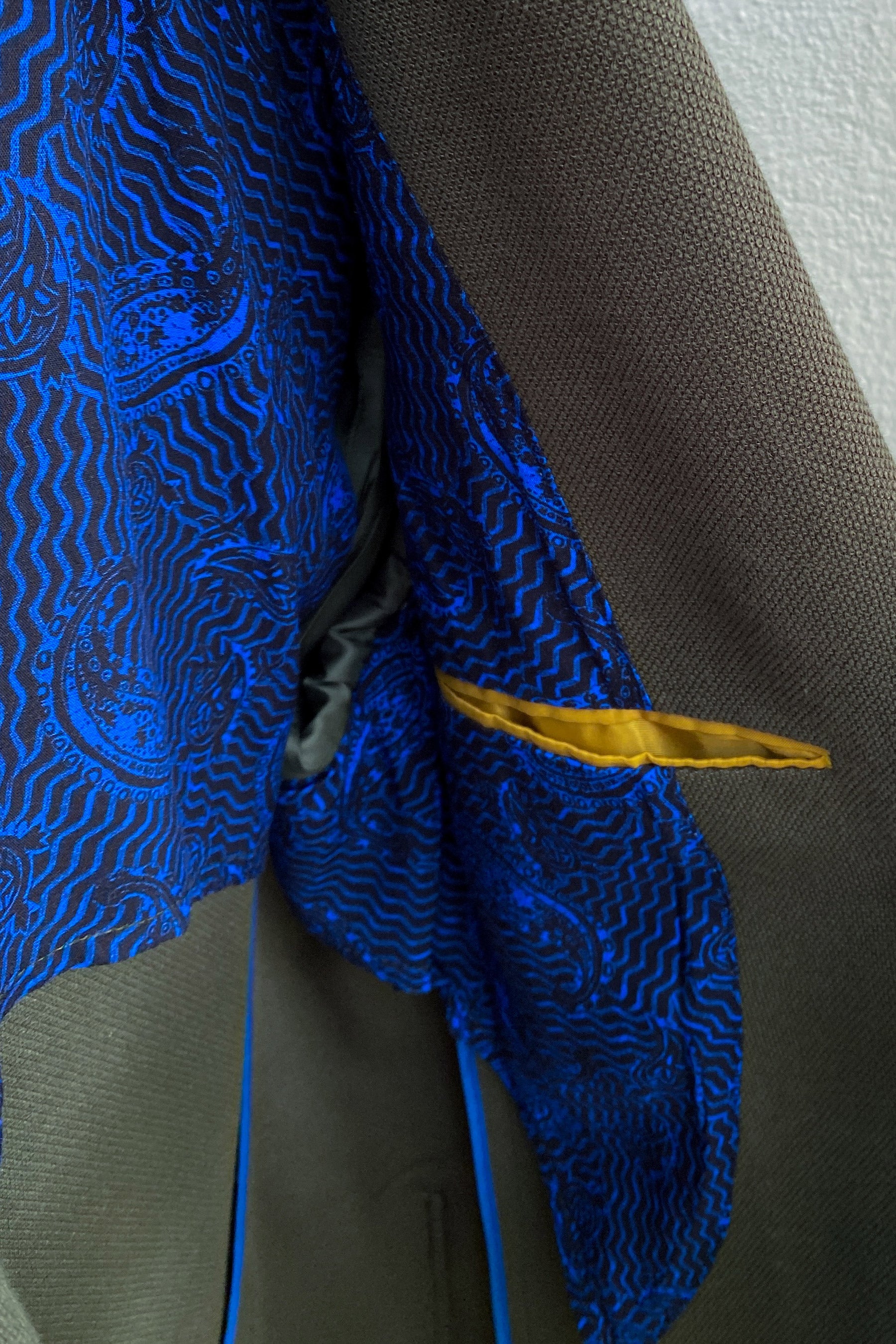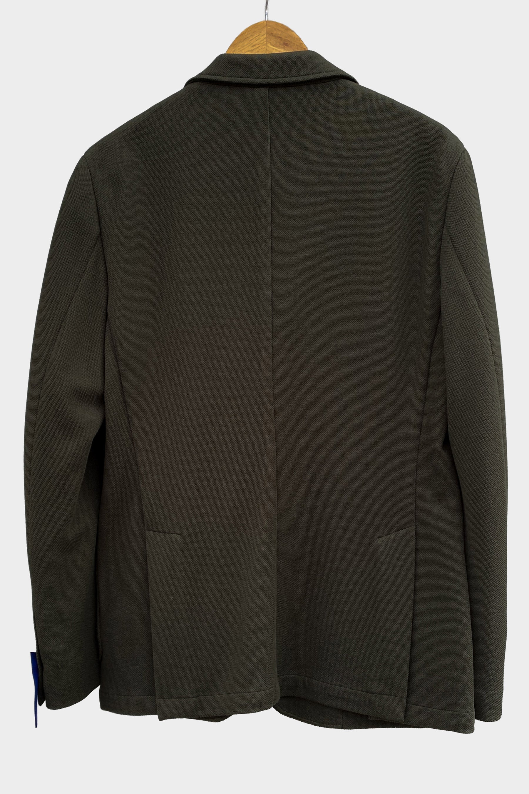Blazer con formato Slim fit fabricado de punto de piqué, mezcla de algodón para que sea elástico. Está semiforrado, tiene cierre de dos botones, dos bolsillos de parche y uno en el pecho, dos aberturas en la espalda, cuatro botones en los puños y ribete de costura a tono. El logo de la marca está representado por un pin extraíble color blanco que lleva en la solapa.