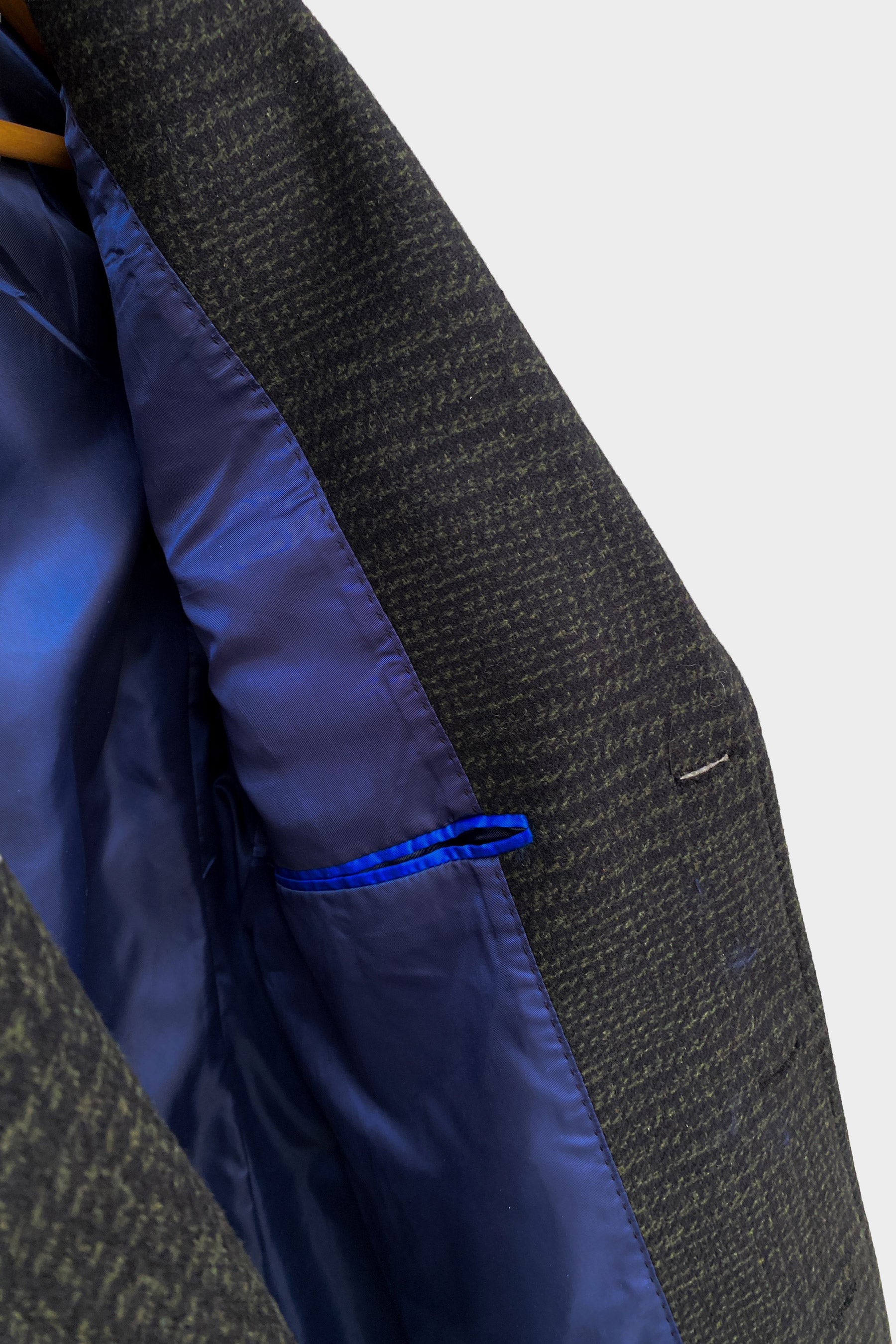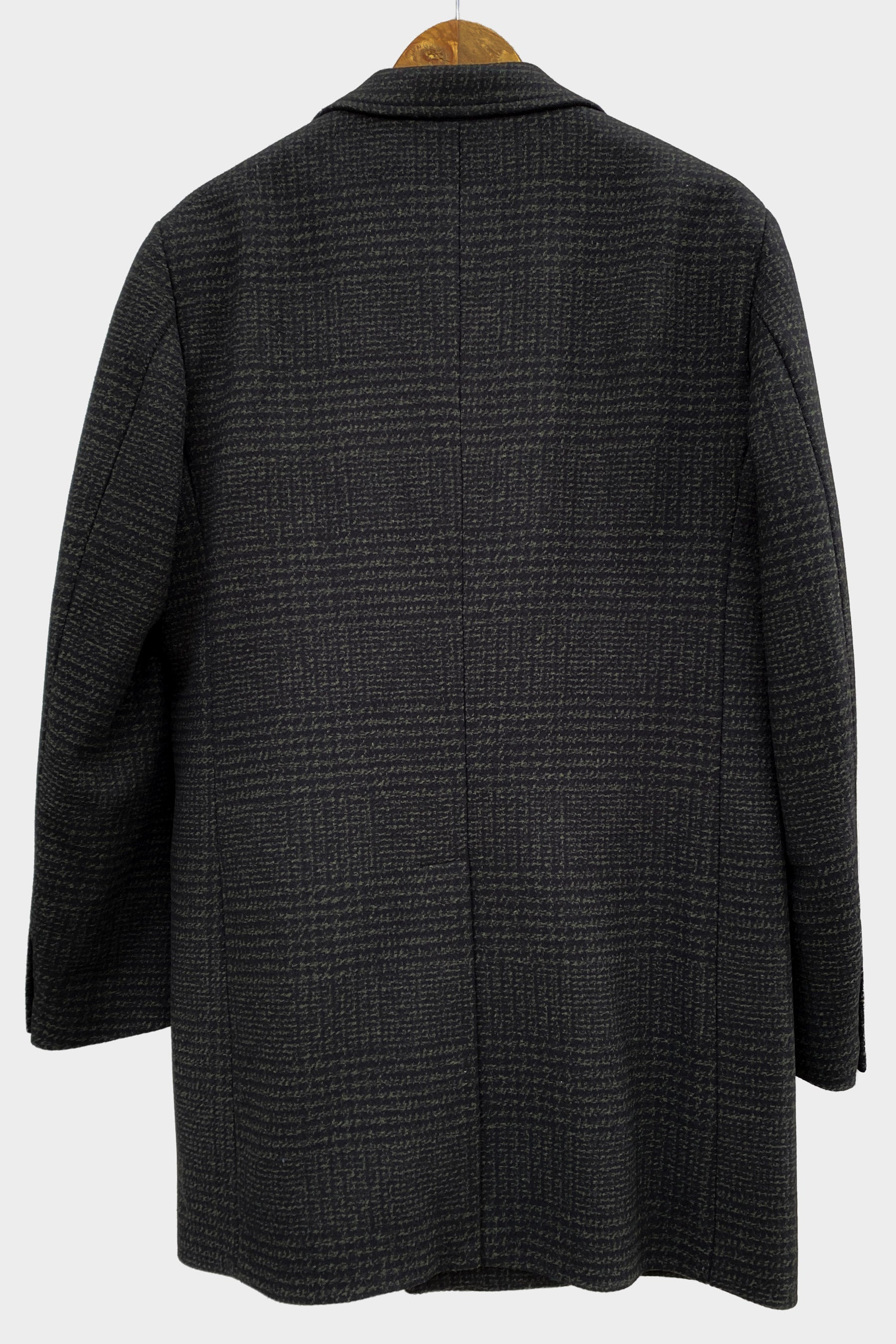 Abrigo de lana con estampado de cuadros en colores oscuros (azul y verde). Es un diseño clásico y elegante de largo medio. Confeccionado en mezcla de lana gruesa y poliester, que lo hace impermeable, se distingue por su cuello con solapa, cierre de tres botones, tres bolsillos exteriores y dos interiores (uno a cada lado) y una abertura trasera para máxima libertad de movimiento. Las mangas terminan en puños de 4 botones.