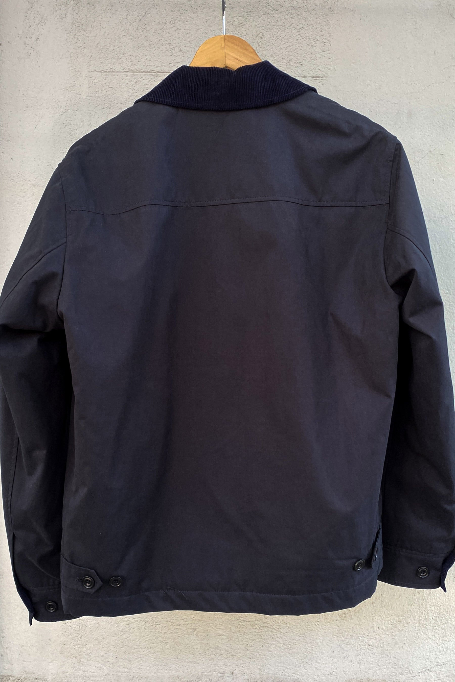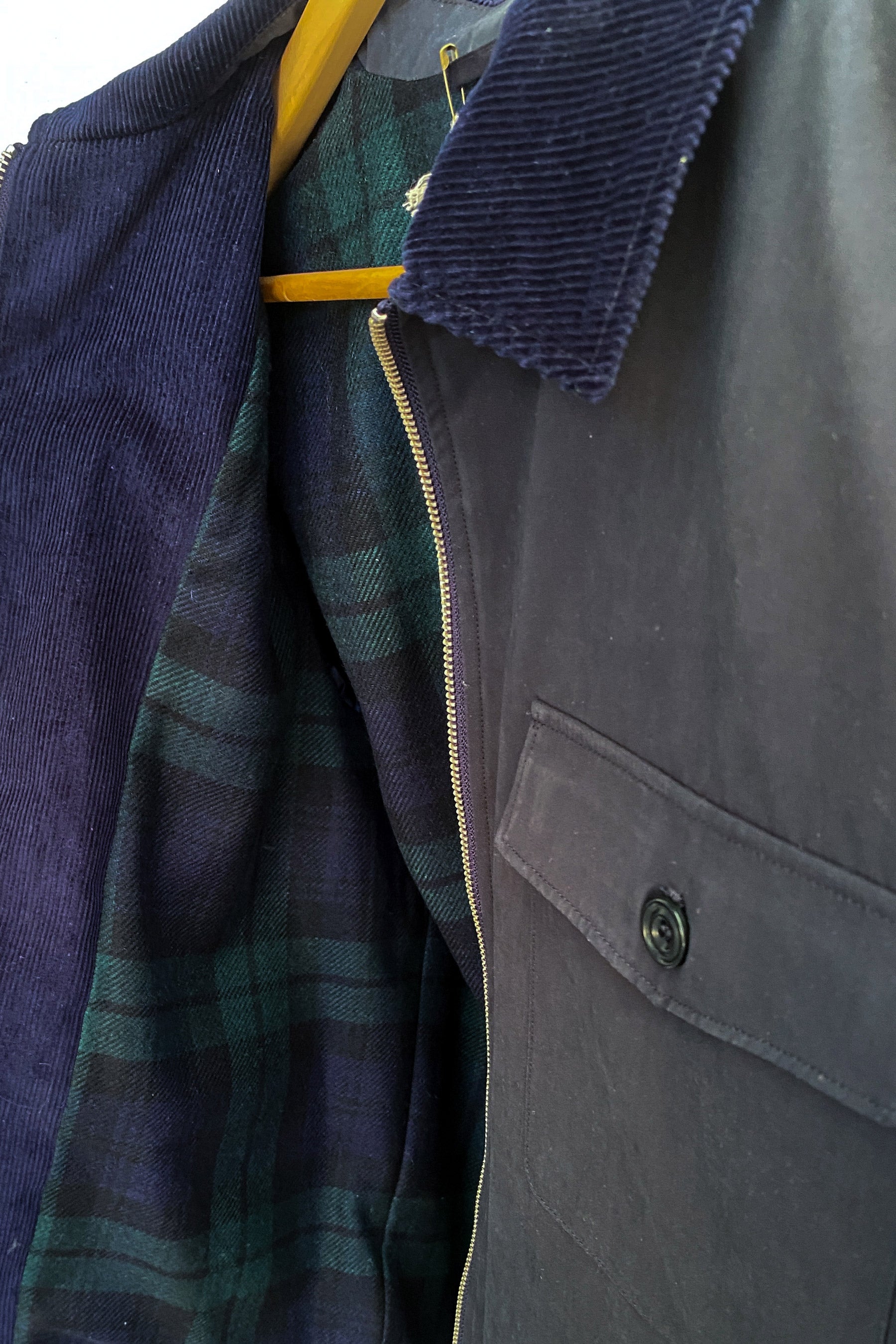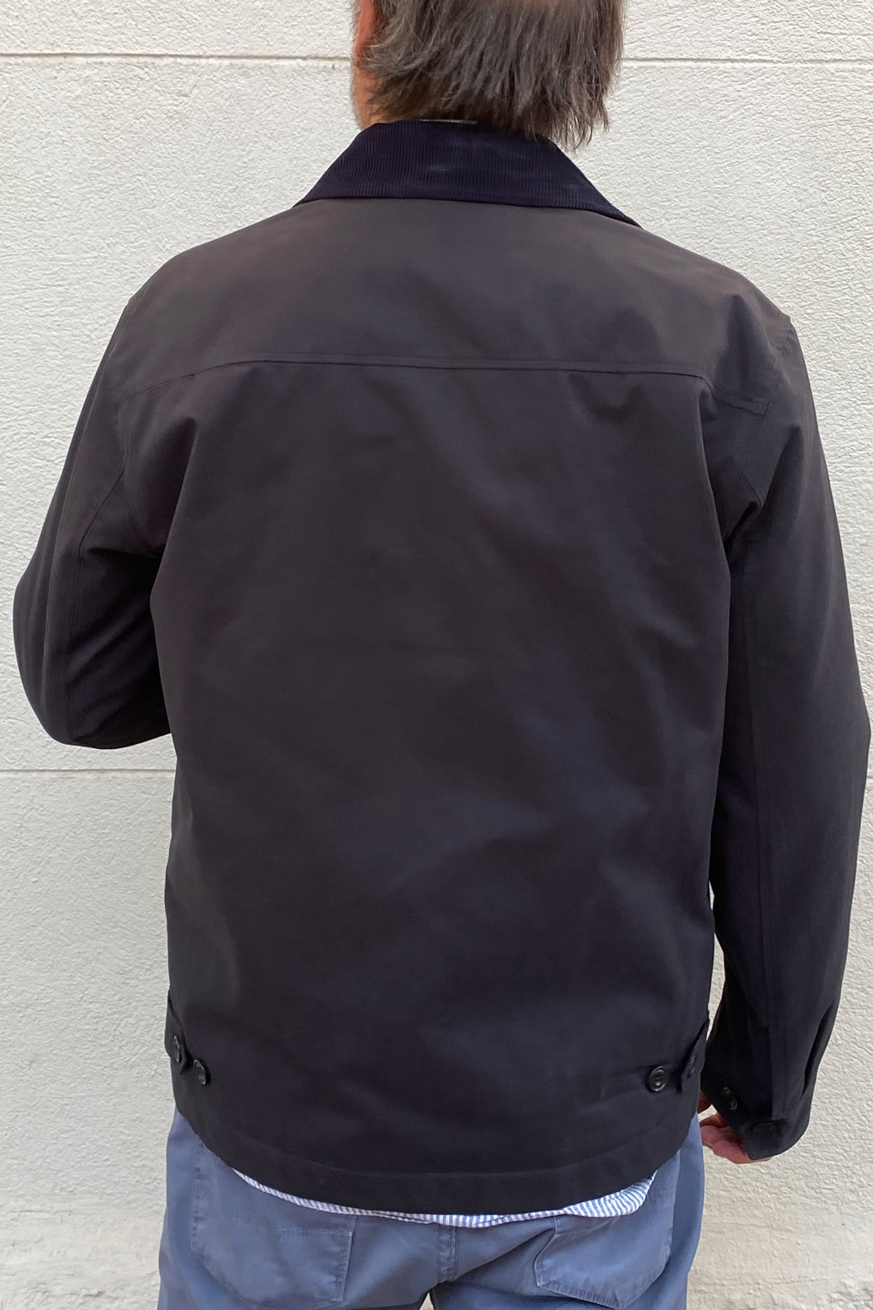 Chaqueta de hombre con cierre de cremallera de doble sentido. Cuello camisero de pana. Dos bolsillos laterales al bies y un bolsillo de parche en el pecho con solapa y botón. Bolsillo interior invisible. En las mangas y en la cintura tapeta de dos botones, para ajustar el puño y para ajustar la cintura. Forro tartan de cuadros y detalles de pana. Está confeccionada en gabardina de algodón técnico repelente al agua y, aunque está diseñada para ser técnica, sus detalles la convierten en una pieza clave de moda.
