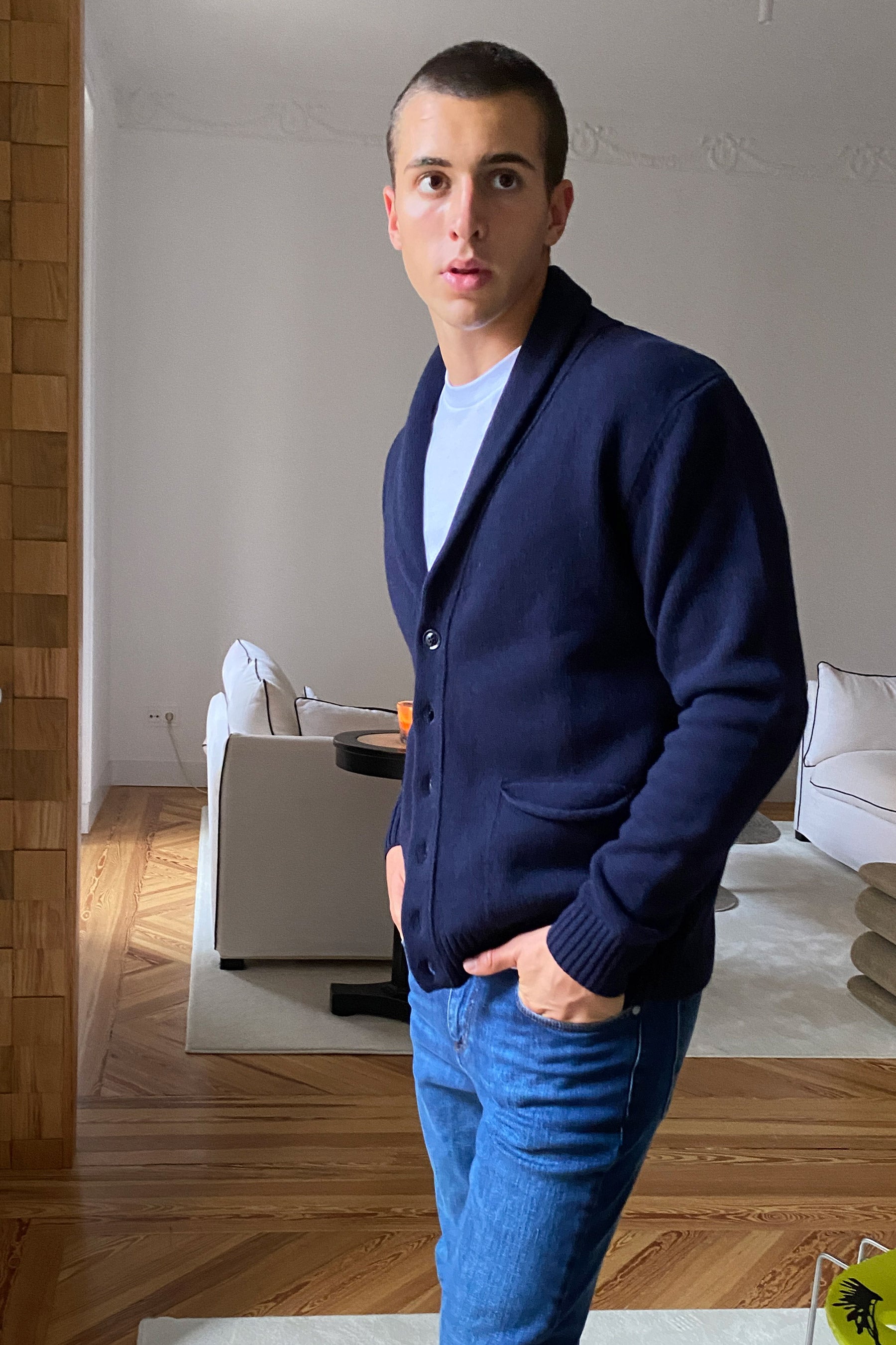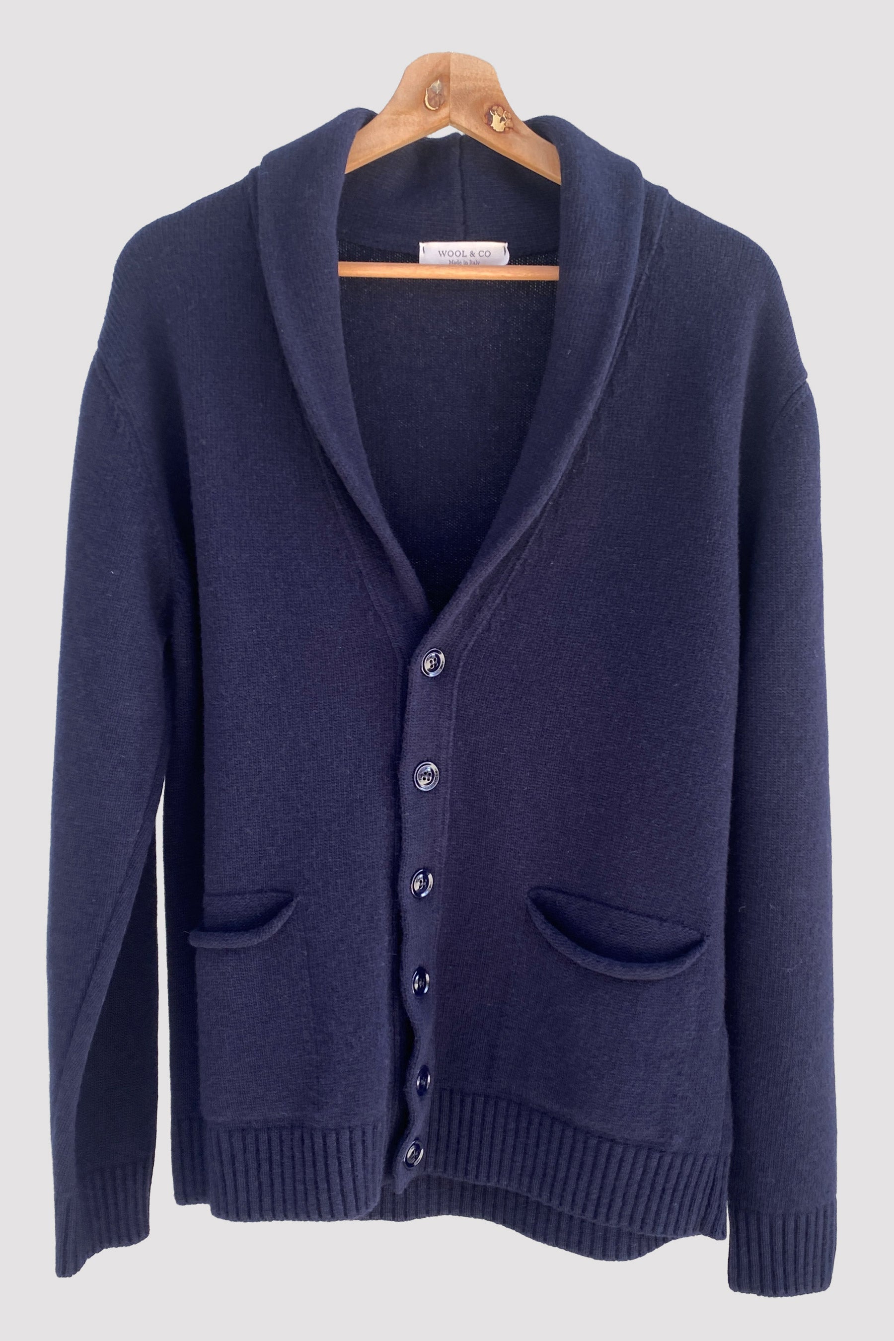 Cárdigan con solapa confeccionado con punto de lana en color marino. Tiene cierre de seis botones en el mismo tono de navy y dos bolsillos en el frente, uno a cada lado.