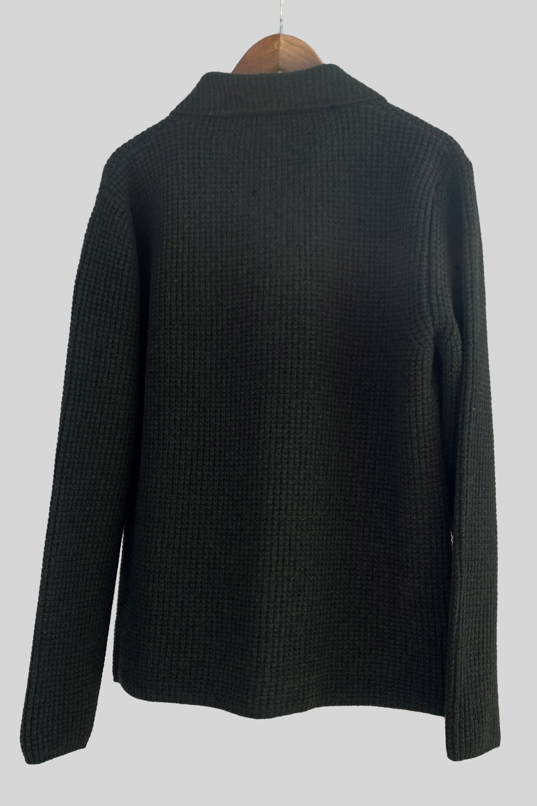 Cardigan con solapa confeccionado con punto de arroz color verde oscuro. Tiene cierre de tres botones en el mismo tono de verde y dos bolsillos en el frente.